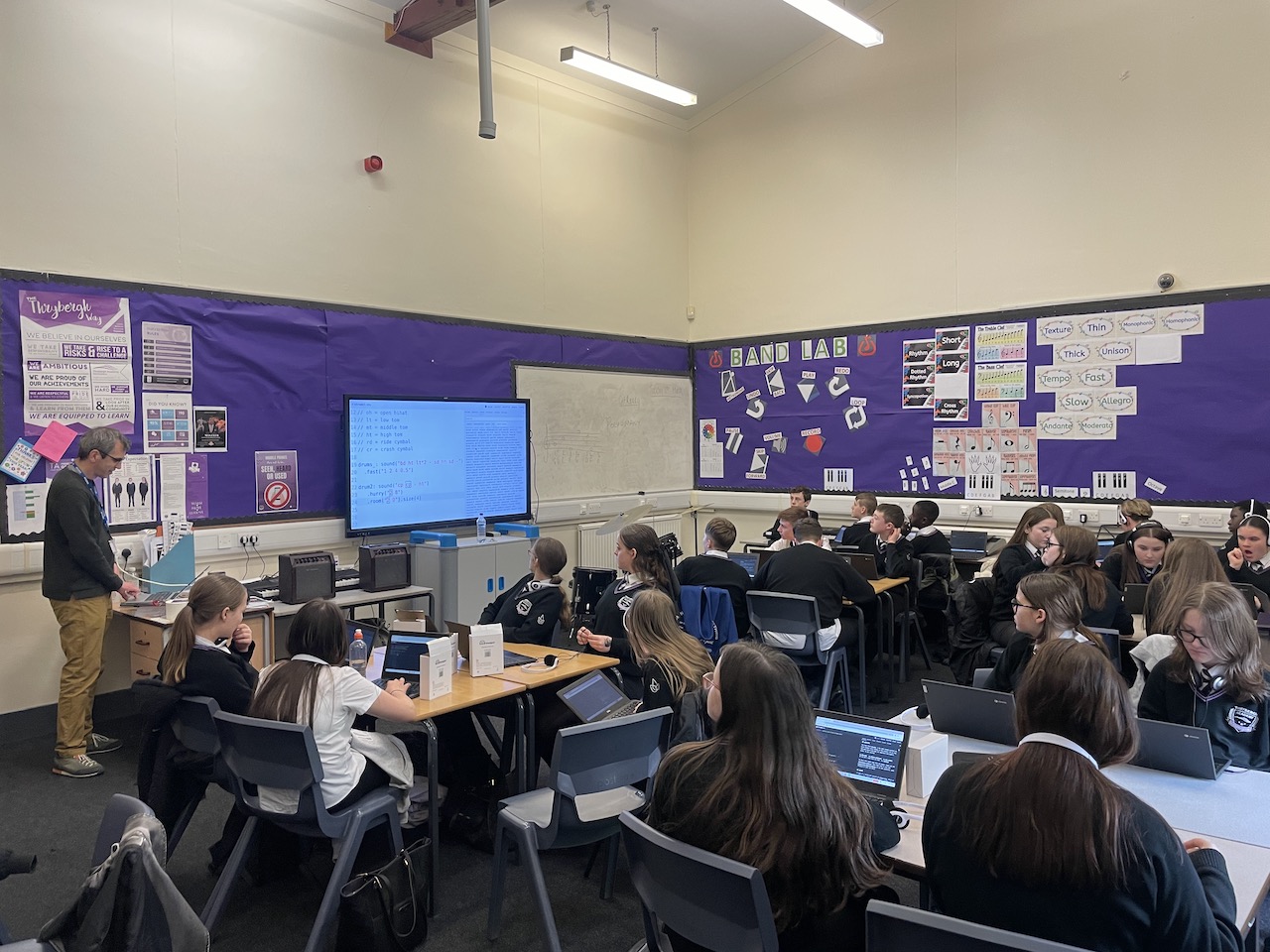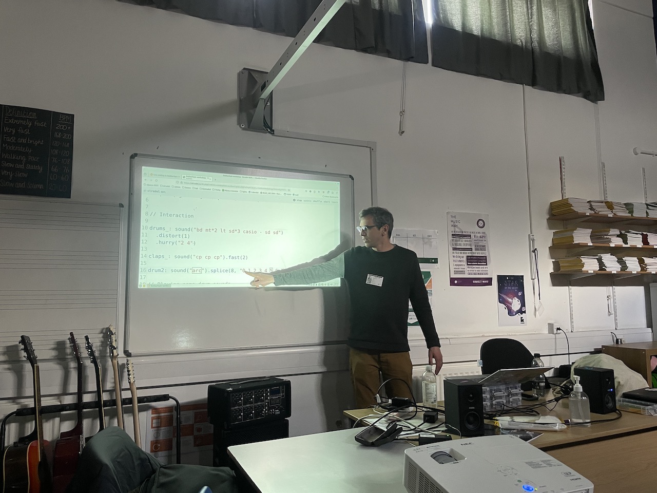 Alex Mclean Live Coding workshop at Thrybergh & Wickersley School March 2025.